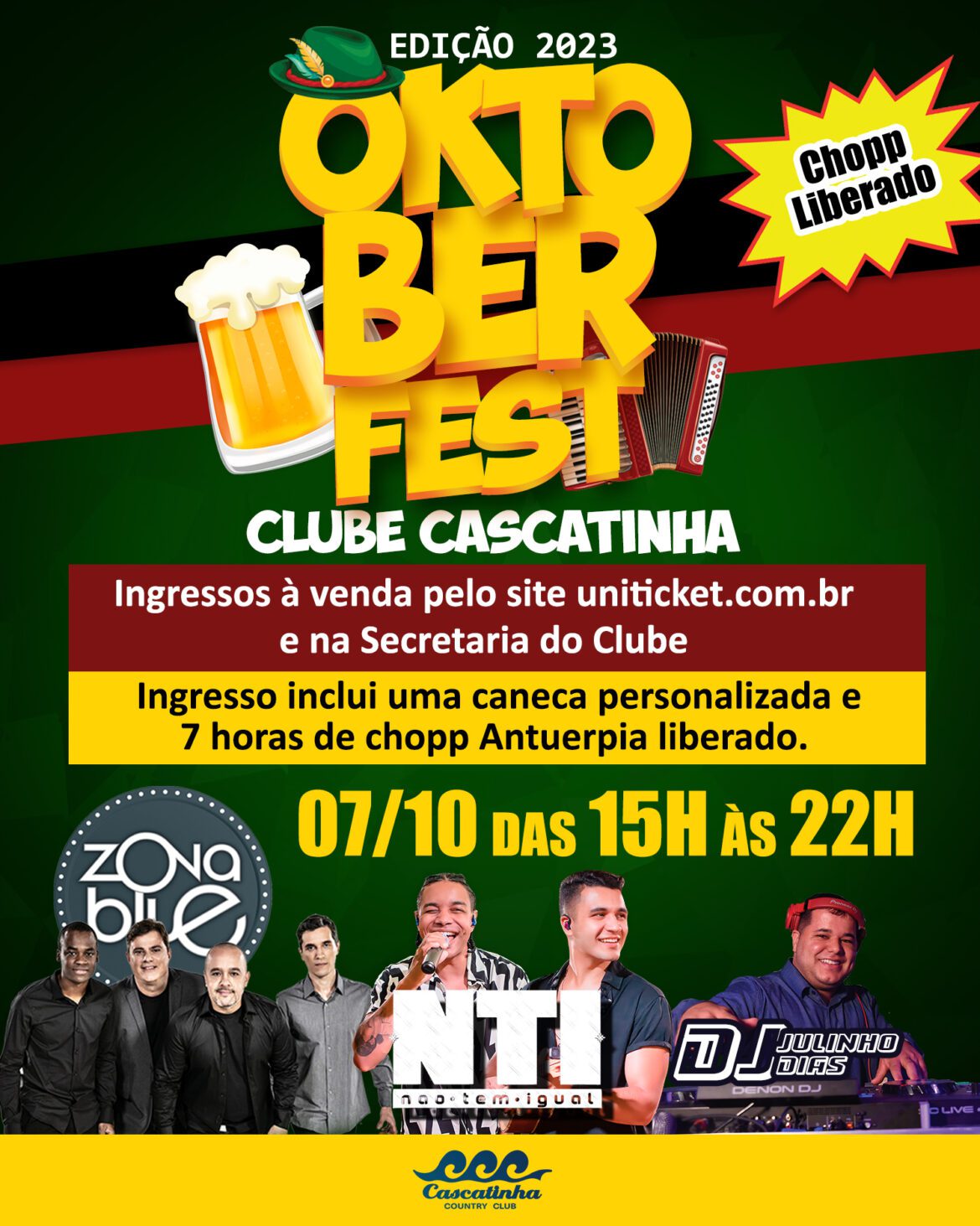 Está chegando o Oktoberfest do Clube Cascatinha! Os ingressos podem ser adquiridos pelo uniticket.com.br e na Secretaria do Clube Cascatinha. Teremos muita música boa e 7h de Chopp Antuérpia.