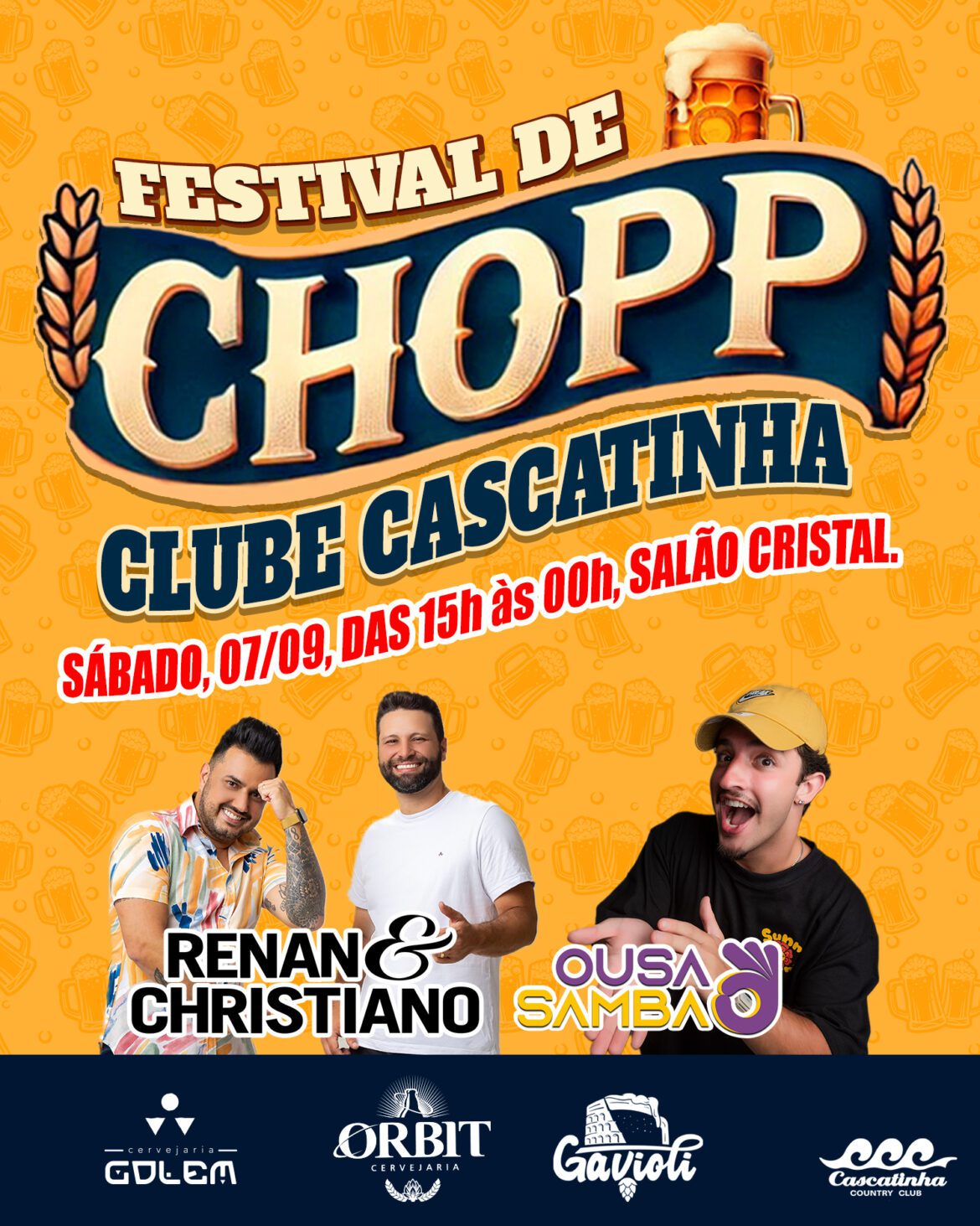 O Festival de Chopp Clube Cascatinha acontece no próximo feriado, 07/09, no Salão Cristal, das 15h às 00h.
