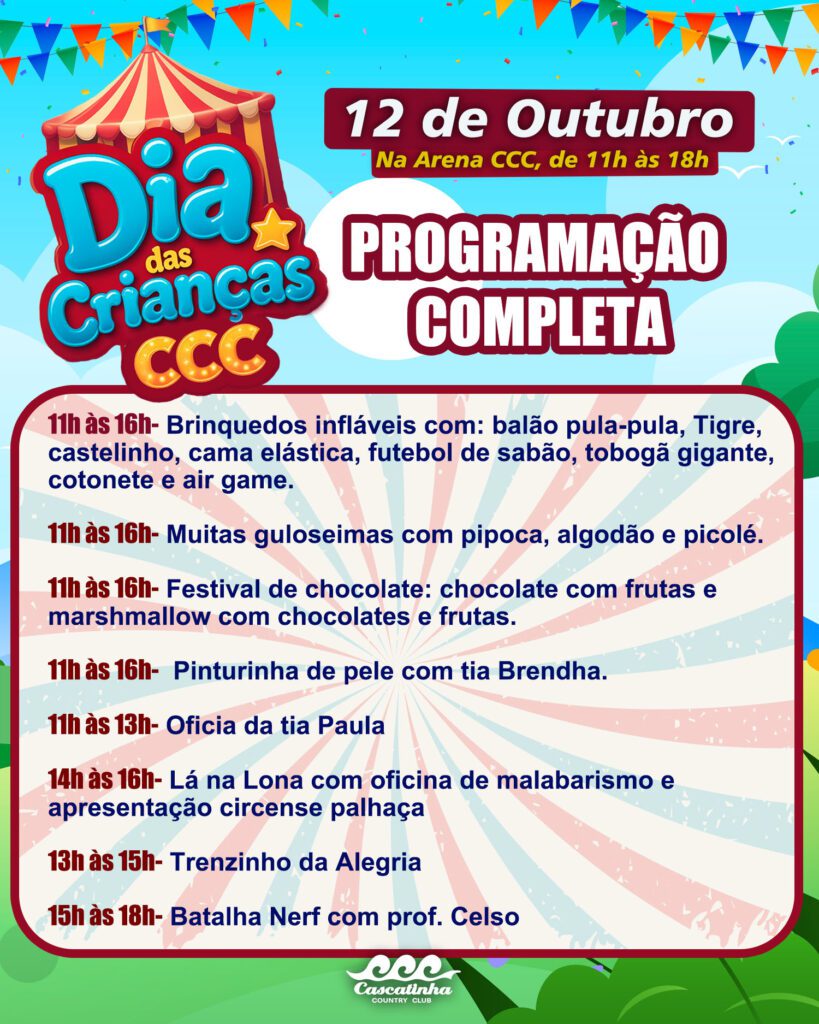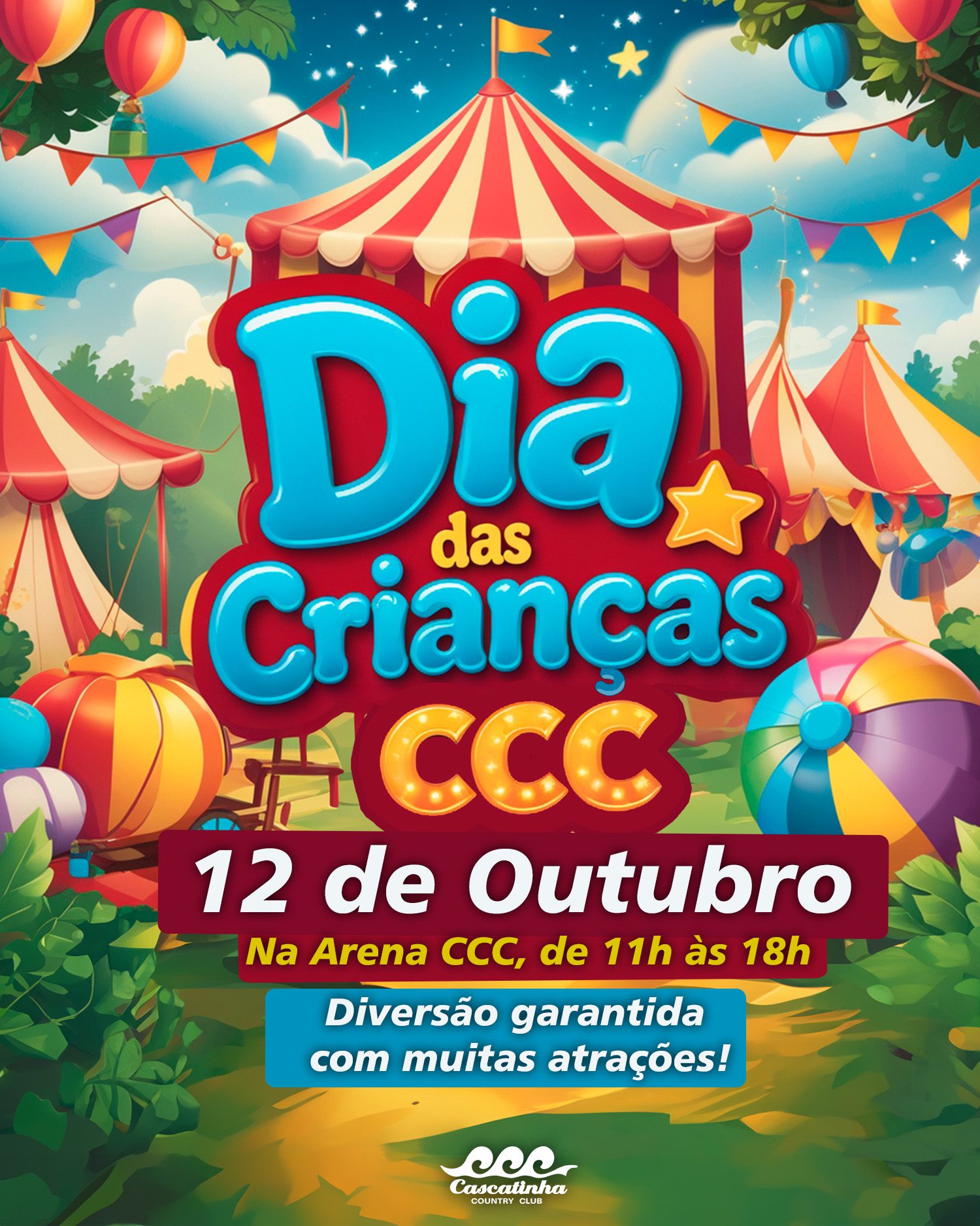 O Clube Cascatinha está preparando um Dia das Crianças cheio de magia, alegria e muitas atrações para toda a família! No sábado, 12 de outubro, das 11h às 18h, a Arena CCC vai se transformar em um verdadeiro espetáculo circense, com atividades e surpresas que prometem encantar os pequenos e divertir os adultos.