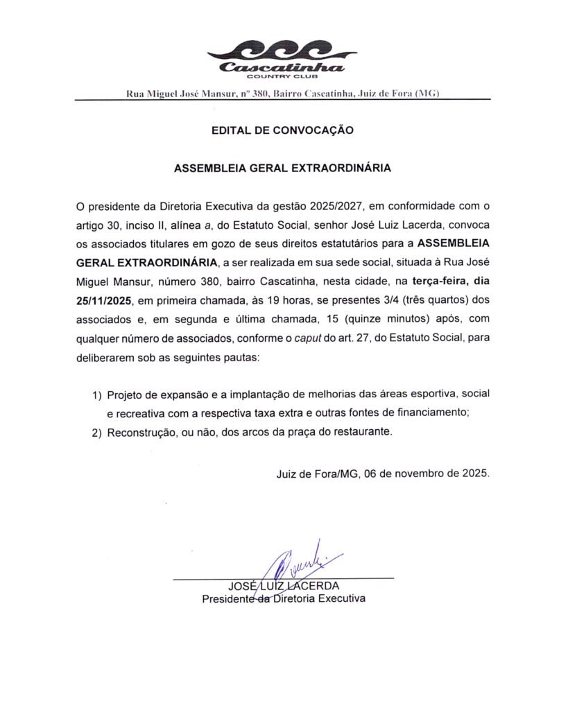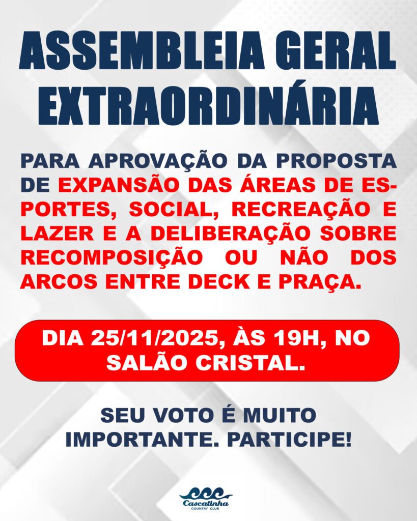 Sem categoria Assembleia Geral by comunicacao 12 de novembro de 2025 written by comunicacao 12 de novembro de 2025 Edital assembleia 0 comment 0 FacebookTwitterPinterestEmail previous post RÉVEILLON CLUBE CASCATINHA 2026 next post PROJETO FAZER+ JUNTOS PARA CRESCERMOS JÁ You may also like PROGRAMAÇÃO CARNAVAL 2026 26 de dezembro de 2025 Colônia de Férias 2026 10 de dezembro de 2025 Procuração Assembleia Geral Extraordinário 25-11-2025 14 de novembro de 2025 PROJETO FAZER+ JUNTOS PARA CRESCERMOS JÁ 13 de novembro de 2025 RÉVEILLON CLUBE CASCATINHA 2026 15 de outubro de 2025 Domingão Esportivo 10 de outubro de 2025 Festa Primavera CCC 8 de outubro de 2025 Dia das Crianças no Cascatinha será um espetáculo de diversão e alegria 8 de outubro de 2025 Um fim de semana inteiro para celebrar o Dia dos Pais no... 23 de setembro de 2025 Cascateiros: 30 Anos de Futebol, Amizade e Tradição 16 de julho de 2025 Leave a Comment Cancel Reply Save my name, email, and website in this browser for the next time I comment.