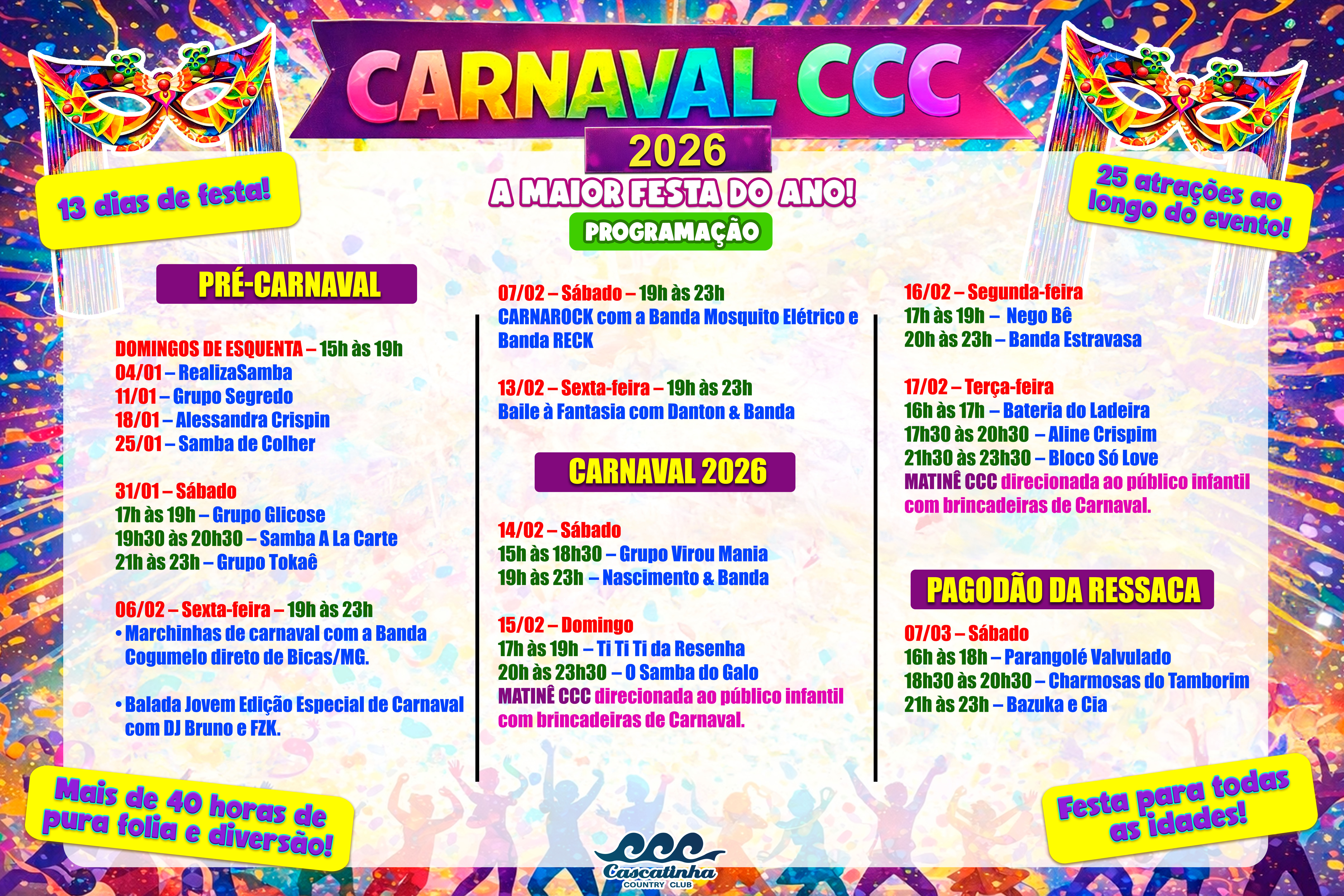 Sem categoria PROGRAMAÇÃO CARNAVAL 2026 by comunicacao 26 de dezembro de 2025 written by comunicacao 26 de dezembro de 2025 0 comment 0 FacebookTwitterPinterestEmail previous post Colônia de Férias 2026 You may also like Colônia de Férias 2026 10 de dezembro de 2025 Procuração Assembleia Geral Extraordinário 25-11-2025 14 de novembro de 2025 PROJETO FAZER+ JUNTOS PARA CRESCERMOS JÁ 13 de novembro de 2025 Assembleia Geral 12 de novembro de 2025 RÉVEILLON CLUBE CASCATINHA 2026 15 de outubro de 2025 Domingão Esportivo 10 de outubro de 2025 Festa Primavera CCC 8 de outubro de 2025 Dia das Crianças no Cascatinha será um espetáculo de diversão e alegria 8 de outubro de 2025 Um fim de semana inteiro para celebrar o Dia dos Pais no... 23 de setembro de 2025 Cascateiros: 30 Anos de Futebol, Amizade e Tradição 16 de julho de 2025 Leave a Comment Cancel Reply Save my name, email, and website in this browser for the next time I comment.